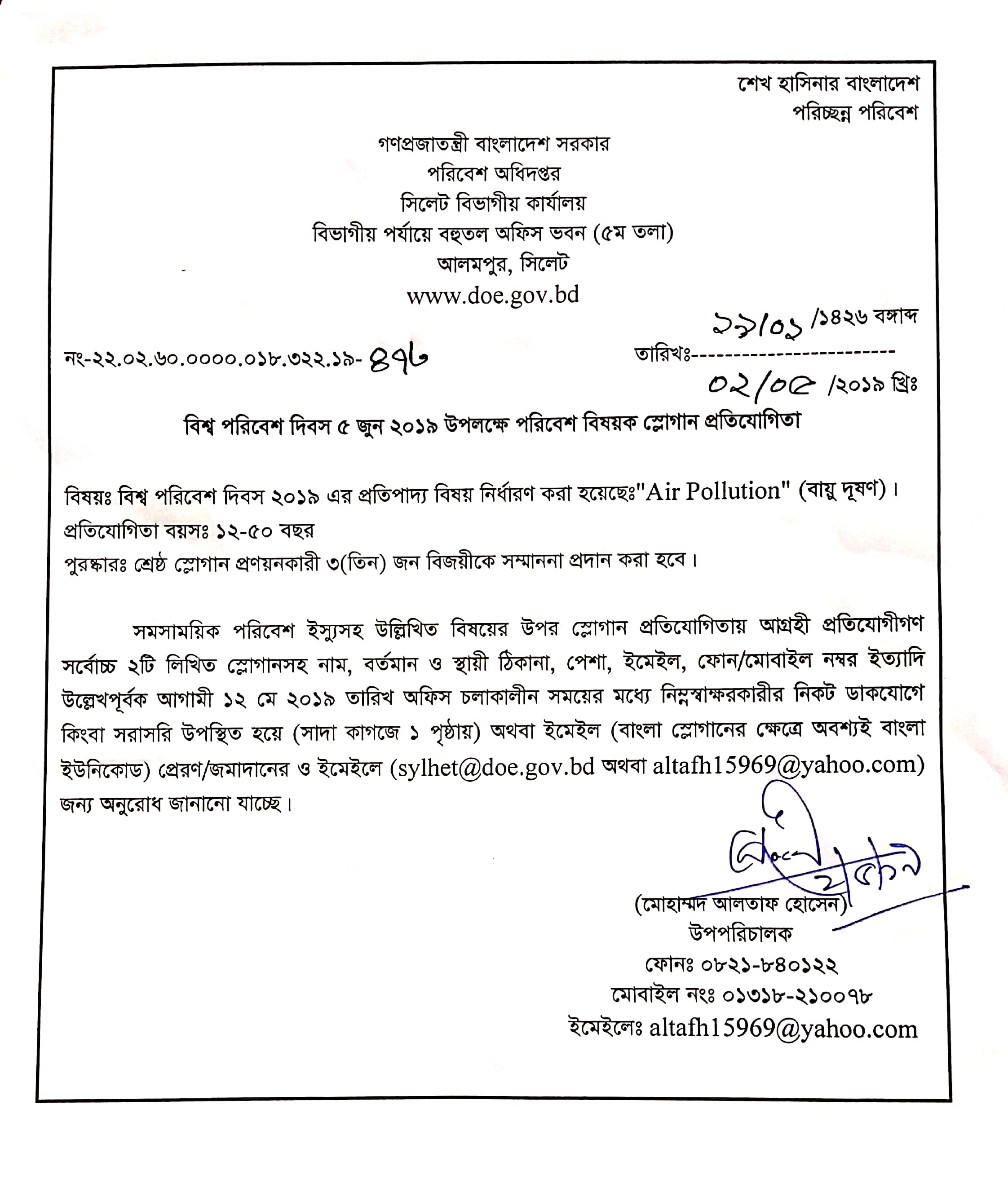বিশ্ব পরিবেশ দিবস ৫ জুন ২০১৯ উপলক্ষ্যে পরিবেশ বিষয়ক স্লোগান।